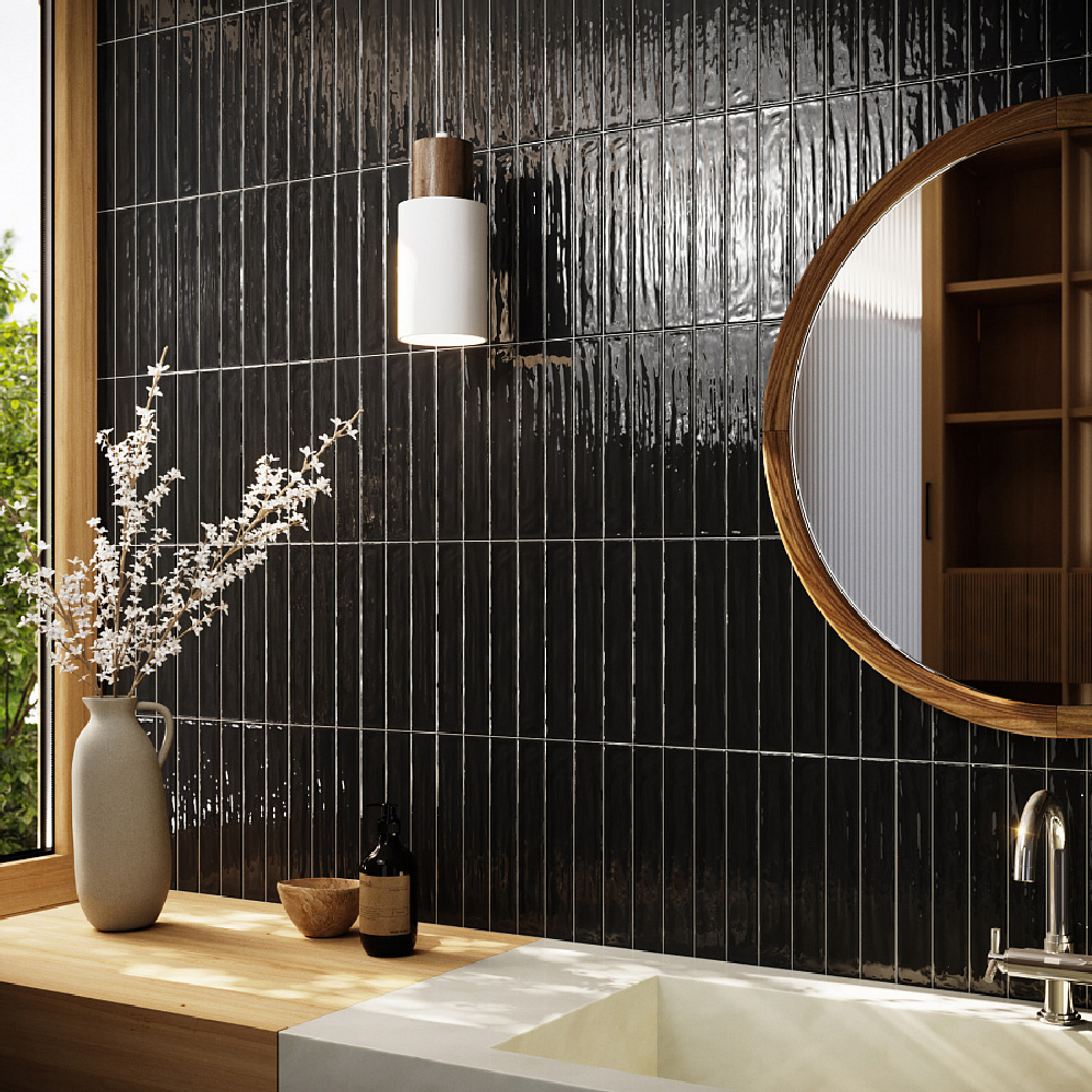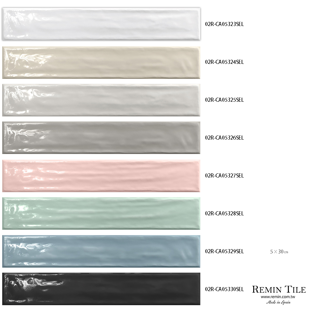 地鐵磚流蘇系列,西班牙進口石英磚,尺寸5x30cm,共8色選擇。表面光澤自然帶有流動紋理,適合浴室、廚房、商業空間,展現現代與復古兼具的設計風格。