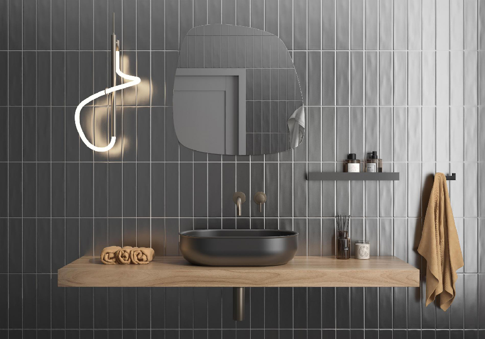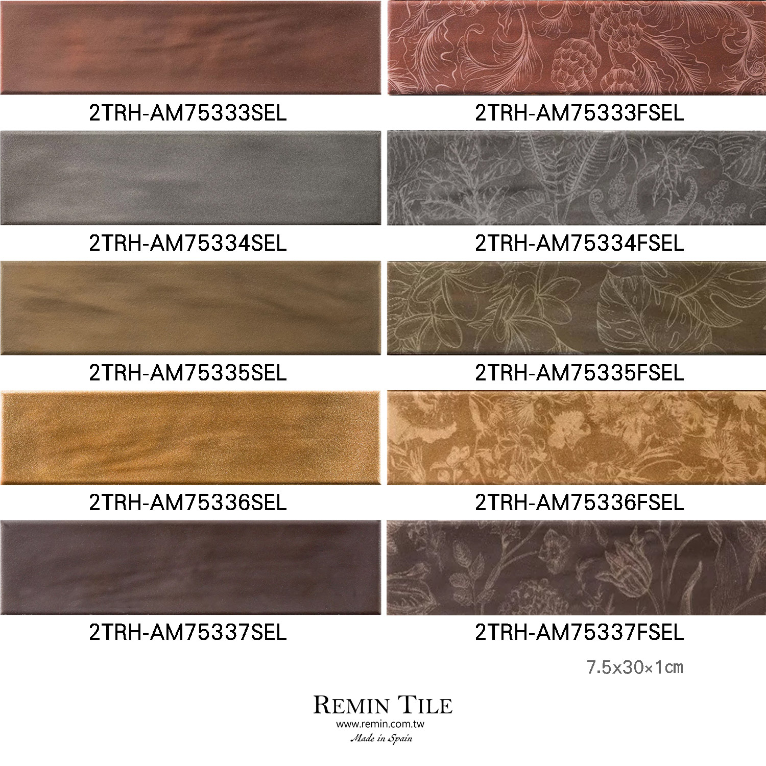 西班牙進口地鐵磚,提供玫瑰金、金、銀、銅、紅銅五色,10 款花紋設計,尺寸 7.5x30cm。打造低調奢華的現代空間氛圍。衛浴、廚房、商業空間背景牆適用。