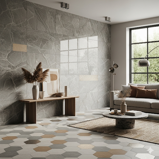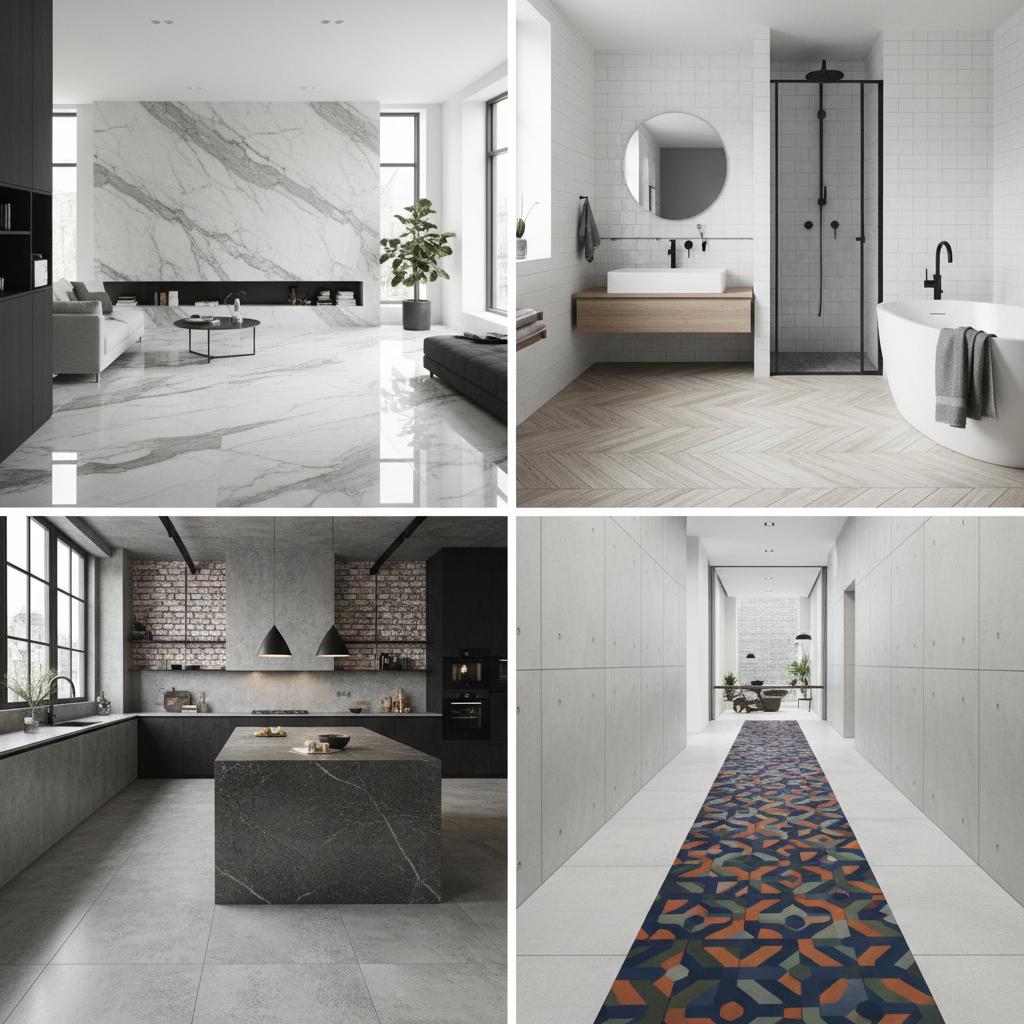 - 多元紋理磁磚:大理石紋、木紋、清水模、水磨石、金屬質感。