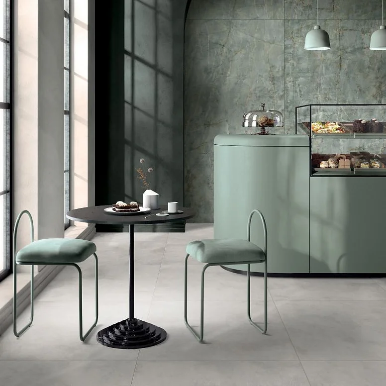 義大利進口大板磚 清墨系列,120×278cm亮面設計,典雅綠色大理石紋理,適合高級住宅與商業空間牆地鋪設,呈現奢華且現代的室內氛圍。