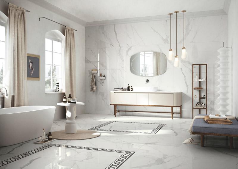 西班牙進口石英磚,120×278 120×120 75×150 60×120 30×60,五種尺寸,提供白、灰、米、黑等22色,地壁皆宜,適合豪宅、商空各種空間裝修,展現奢華質感。