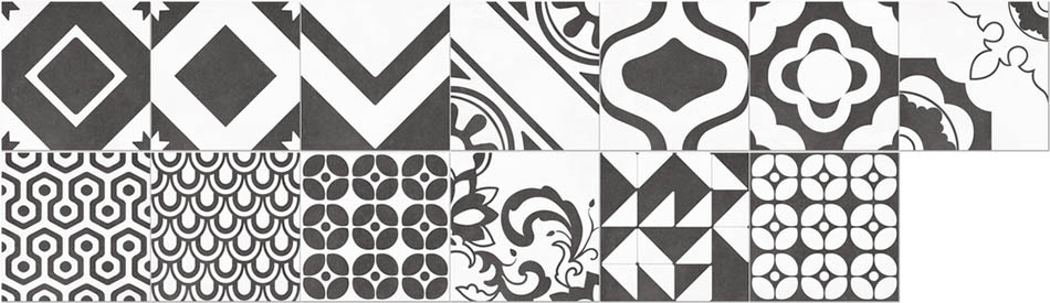 義大利進口藍調花磚,20x20cm 復古幾何圖案,6 款花色可選,適用於地板與牆面。融合黑白與藍色調,打造歐式復古與現代設計風格。