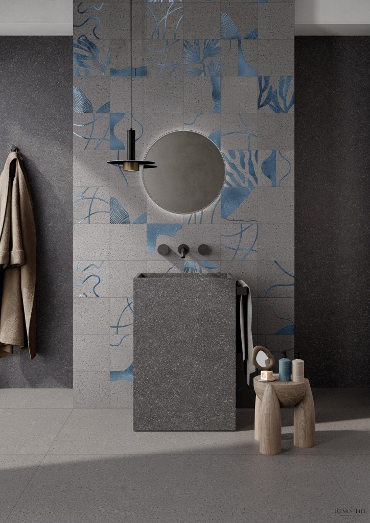 穩重內斂,結合細膩磨石工藝,重現經典與現代的交融美學。以紅、藍色點綴,如工匠筆下的細緻圖騰,每一片皆蘊含手作質感與藝術靈魂。無論大面積鋪陳或局部點綴,皆能為空間帶來層次感與獨特個性。