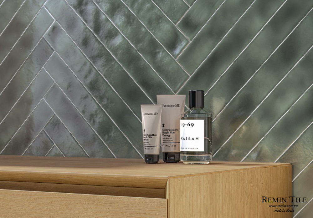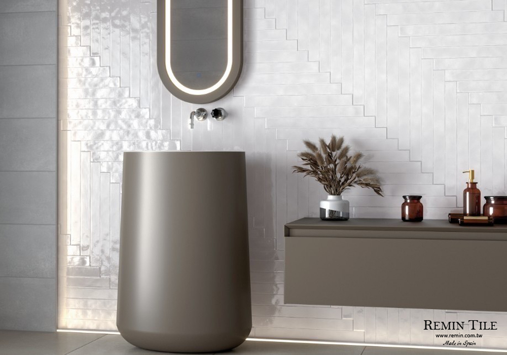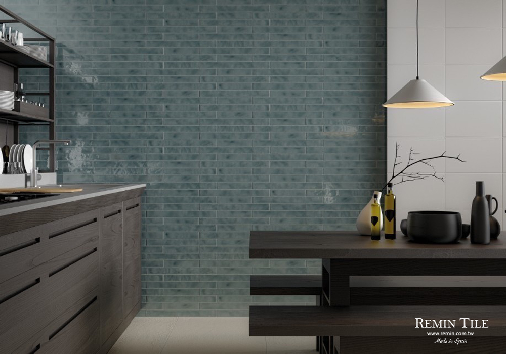 西班牙進口夜映石地鐵磚,5×50cm 長條比例設計,石英磚材質耐磨耐用,提供白、香草色、藍、綠、珍珠色、灰黑、米色七種色彩,適用於浴室、廚房、餐廳等牆面,營造高質感空間氛圍。