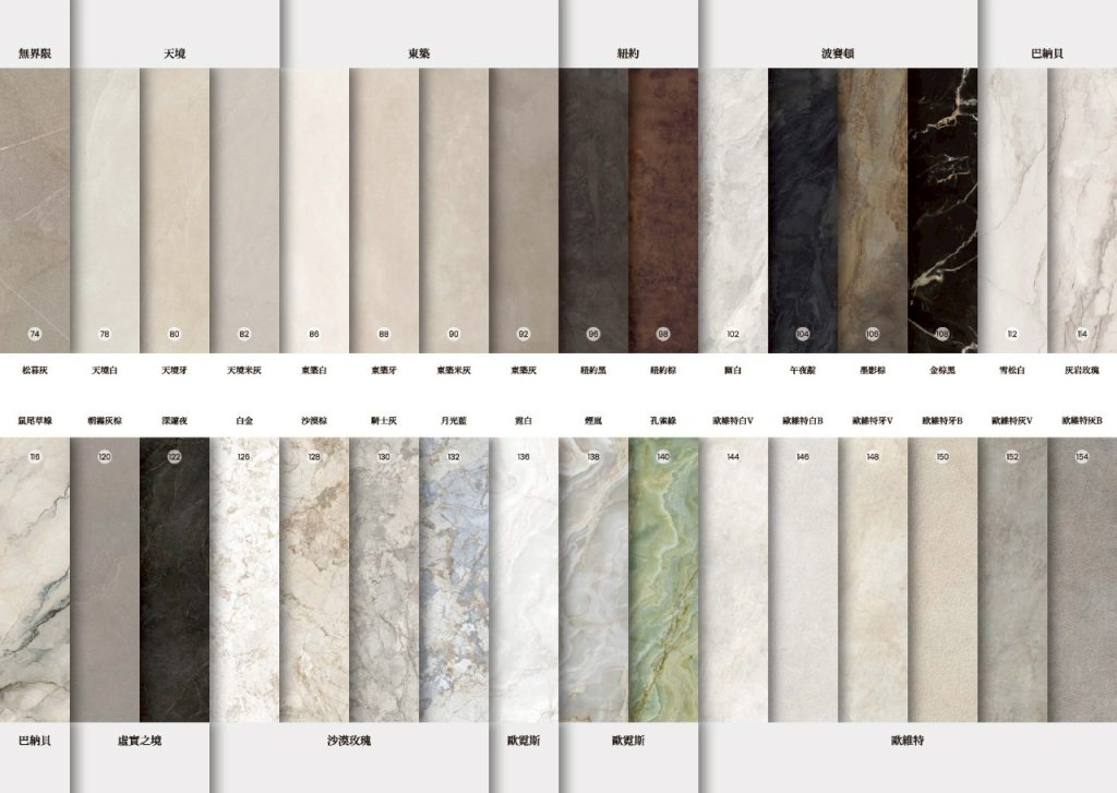 義大利進口大板薄板系列,提供 120×260、120×278、120×280 多種尺寸。完整收錄石紋、奢石、白石、黑石、綠石等設計款式,適用地壁兩用。以 6mm 薄板打造輕量大面積視覺,適合住宅、商空、飯店、設計案使用。
